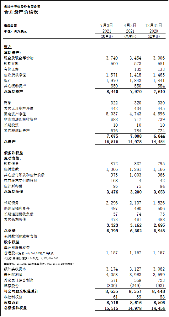截至2021年7月3日,意法半导体的净财务状况(非美国通用会计原则)为10.8亿美元;2021年4月3日为11.9亿美元。流动资产总计42.5亿美元,负债总计31.7亿美元。