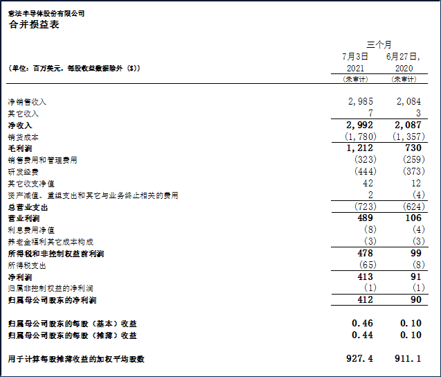 “上半年净营收同比增长39.1%,除射频通信子部门外,所有产品部门都实现净营收增长。营业利润率为15.5%,净利润为7.76亿美元。