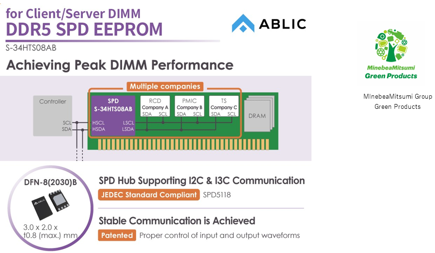 美蓓亚三美株式会社(MinebeaMitsumi Inc.) 旗下的艾普凌科有限公司(ABLIC Inc.,总裁:田中诚司,总部地址:东京都港区,下称“ABLIC”)今天推出了DDR5存储器模块用IC的SPD「S-34HTS08AB」。