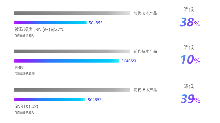 SC485SL支持CMS2和CMS4两种相关多采样(CMS)模式及12bit量化模式,能有效降低读取噪声并提升动态范围。相较前代技术产品,SC485SL的读取噪声(RN)和光响应不均匀性(PRNU)分别降低约38%和10%。同时,该新品拥有出色的SNR1s值,相较前代技术产品降低约39%。因此,在夜晚户外、地下停车场等暗光场景中,SC485SL依旧能为摄像头带来画质细腻、清晰准确的图像效果。