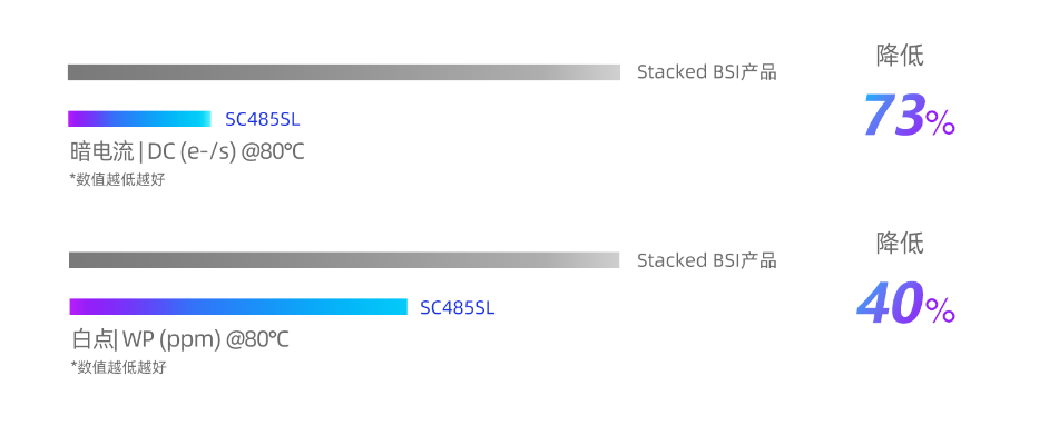 得益于思特威先进的SmartClarity®-3工艺技术,SC485SL在高温成像性能方面具备出色的表现。在80℃高温条件下,SC485SL的暗电流(Dark Current)和白点(White Pixel)较业内同规格Stacked BSI产品分别大幅降低约73%和40%,即使面临户外高温干扰时依旧能提供清晰准确、色彩真实的影像。