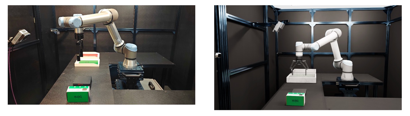 机器人仅基于合成数据进行训练,即可抓取不同形状和大小的包装和产品,以进行外观检查。真实工作站(左)与仿真工作站(右)。图片由亚马逊设备与服务部门提供。