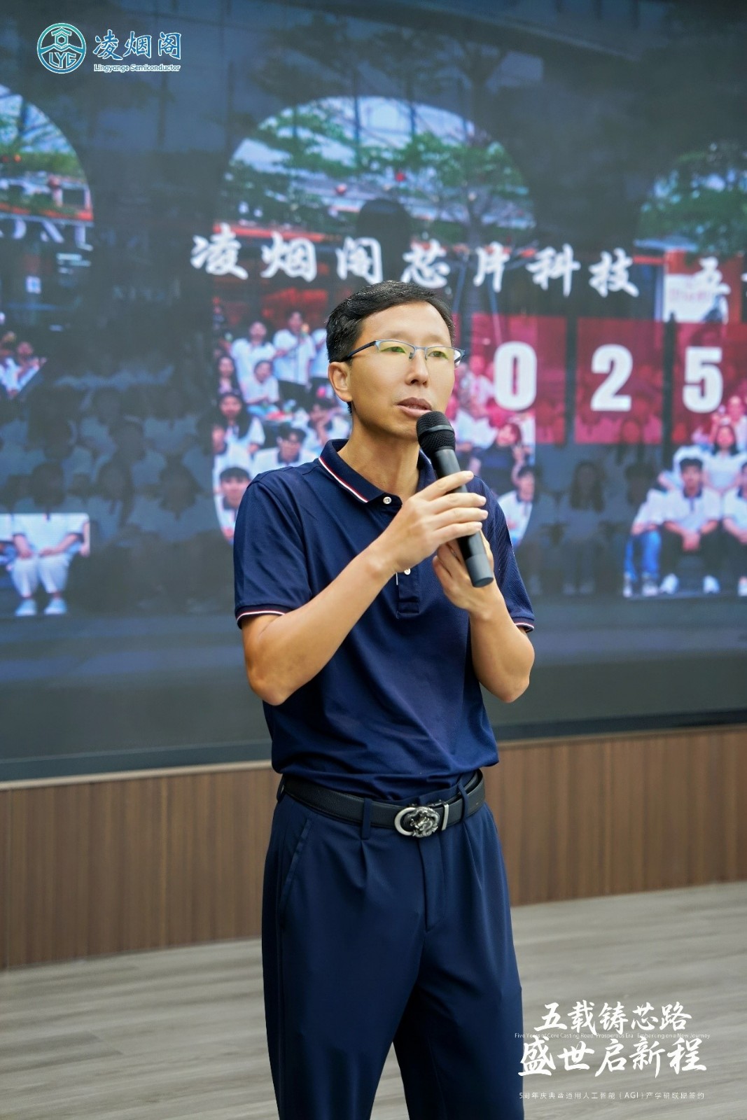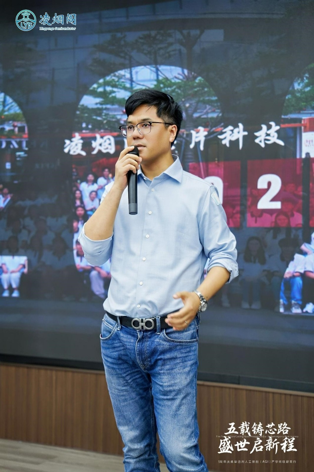 凌烟阁执行长李宏俊在致辞中回顾了公司五年的“芯”路足迹。自成立以来,凌烟阁始终扎根横琴,深耕半导体赛道。五年来,从初创时期的单一项目攻坚,逐步突破技术瓶颈、实现成果落地转化,成长为如今拥有 150 +人团队、营收累计突破12亿元,还通过横琴半导体研习营为行业培训500余名基础工程人才,成为名副其实的 “半导体人才摇篮”。
