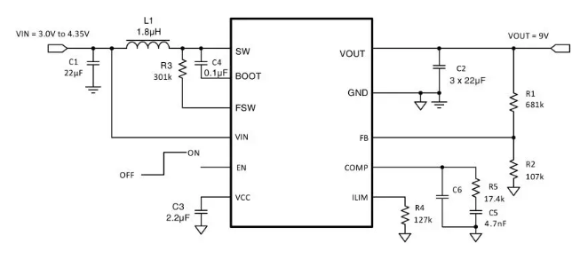 效率高达90%(VIN=3.3V,VOUT=9V,IOUT=2A时)