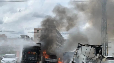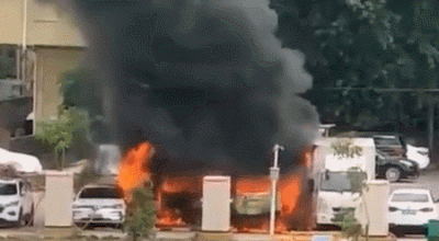 2020年5月8日14时23分,广东东莞市塘厦镇木莲路旁一辆东风牌新能源汽车在充电充电时突然起火,现场浓烟滚滚,并伴随爆炸。据监控显示,在14时23分10秒左右,第一台电动汽车在充电时底部瞬间冒出大量黑色浓烟,底部起火之后引燃旁边停放的一台电动货车,由于现场风力较大,导致另外两台电动汽车也被引燃!