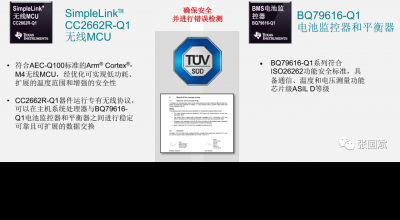 右边的BQ79616实际上是一个系列芯片,在这个系列有不同的通道数选择。BQ79616是16个通道,同时也有引脚和软件兼容的12个通道、14个通道和16个通道。引脚和软件兼容可以给用户提供最大的设计的灵活性,帮助他们在系统上降低成本。“如果有一个电池包的模组要求是28个电芯,假如用16通道的芯片,只能用两片16通道芯片,也就是32个通道。实际只需要28个通道,有4个通道浪费了,不过因为BQ79616和BQ79612这两颗芯片是引脚和软件都兼容的,所以可以用一片BQ79616加上一片BQ79612就可以拼成一个28通道模组,这样没有任何一个通道被浪费了。”他解释了如何节省成本。“最重要的BQ79616芯片或这一系列的芯片都符合ISO 26262 SÜD级别标准。我们在通信、电芯温度、电芯电压测量等功能方面都可以达到SÜD级别。”