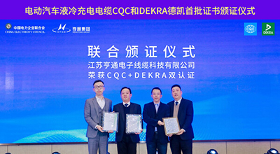 DEKRA德凯与中国质量认证中心(CQC)联合为亨通集团旗下江苏亨通电子线缆科技有限公司(以下简称“海门亨通”)颁发国内首批液冷充电电缆产品认证证书。