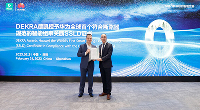 2023年2月21日,全球领先的检验、检测及认证机构DEKRA德凯为华为颁发全球首个符合断路器规范的智能组串关断SSLD证书。颁证仪式于华为数字能源公司深圳安托山总部举行。