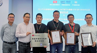 近日,TÜV南德意志集团携手中国信息通信研究南方分院,为TCL实业控股股份有限公司颁发双方共同签署的TÜV 南德首张智屏产品智能终端网络安全检测联合声明,以证明TCL TC8000 P12G获得YD/T 2407和TÜV南德ETSI EN 303 645的双重认证